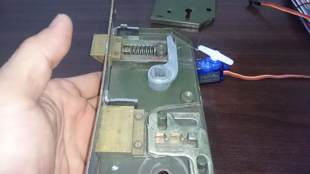 Remove the "d" shape lever and tie up the thin nylon fishing line to the door latch. Tie up the other end to the servo's horn. Make it as close as possible to the door latch case, because we don't have much room inside the door or you want to dig it deeper. Now put back the "d" shape lever.